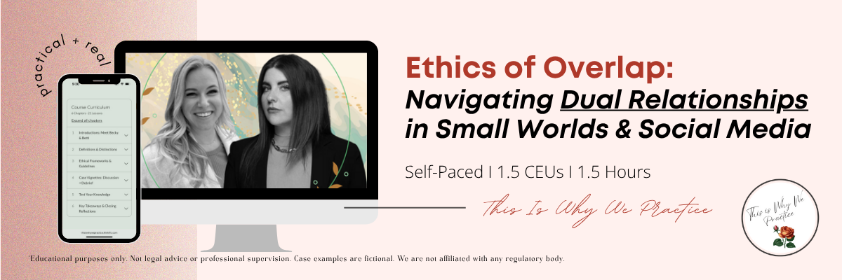 Dual relationships are everywhere- online and off. They show up in DMs, mutual follows, community spaces, and casual overlaps that can escalate fast. When the line between connection and complication blurs, ethical clarity isn’t optional, it’s essential. This course gives you practical, nuanced tools to navigate dual roles before they get murky. Perfect for anyone already thinking about boundaries, professional presence, and scope of practice while there’s still time to learn, reflect, and earn CE credit before the next tricky situation lands in your inbox or counselling room.
