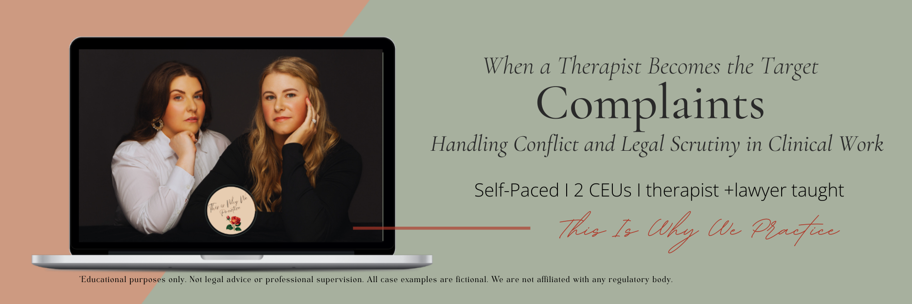 This course is provided for educational and reflective purposes only. The content is intended to support professional learning, ethical awareness, and general understanding of clinical, regulatory, and legal processes. It does not constitute legal advice, clinical supervision, therapeutic treatment, or regulatory guidance. Case examples presented in this course are fictional and are used solely for illustrative and educational purposes. Any resemblance to real individuals or situations is coincidental. Participation in this course does not create a lawyer–client, supervisor–supervisee, or therapeutic relationship between participants and the facilitators. Clinicians are responsible for applying the material in a manner consistent with their own professional judgment, scope of practice, regulatory requirements, and applicable laws within their jurisdiction. While the course includes BC-specific references, the content is not a substitute for consulting a qualified lawyer, professional liability insurer, clinical supervisor, or regulatory body regarding individual circumstances. We are not affiliated with any regulatory body.